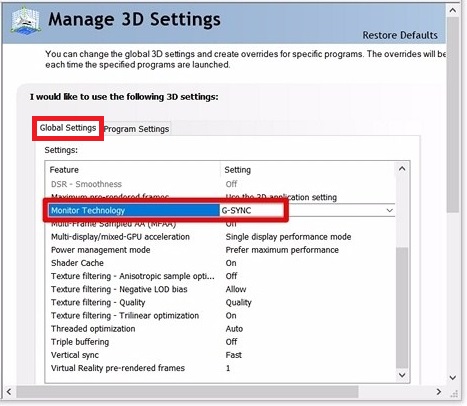 - Under Global Settings, make sure the Monitor Technology is set to G-Sync. In the event that it’s set to Fixed Refresh Rate, switch it to G-Sync.