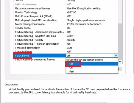 - Now scroll all the way down in the Global Settings. You’ll notice an entry called Vertical sync. Make sure you set it to Off. As we already discussed above, Vertical Sync is very inferior to G-Sync because it will cause a lot of pointless input lag. If you can use G-Sync on your monitor, make sure Vertical Sync is not an option.