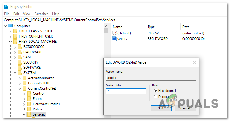 - Next, double-click on the secdrv Dword value, set the Base to Hexadecimal and value Data to 2.