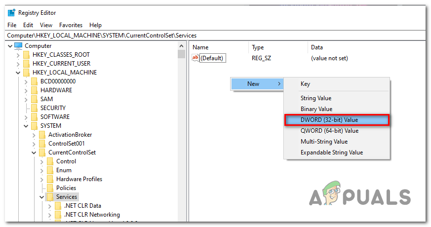 - Once you get to the correct location, move over to the right-hand side, right-click on an empty space and choose DWORD (32-bit) Value.