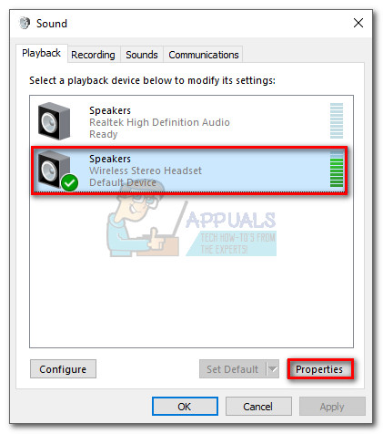- Once you enable Windows Sonic, return to the sound window (if closed repeat step 1), select your headphones and click the Properties button.