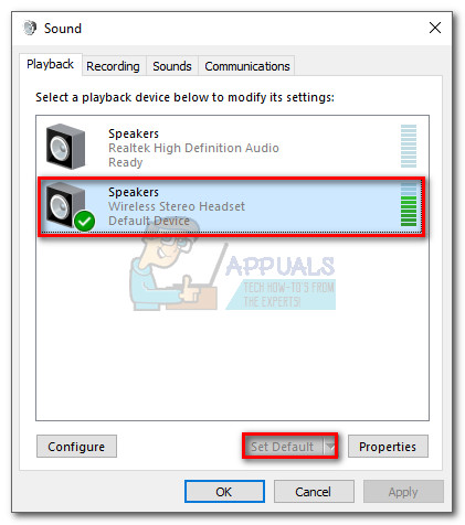 - Select the Playback tab and make sure your headset is set as the default choice. If it’s not, select it and click the Set Default button. You shouldn’t close this window as we’ll return to it momentarily.