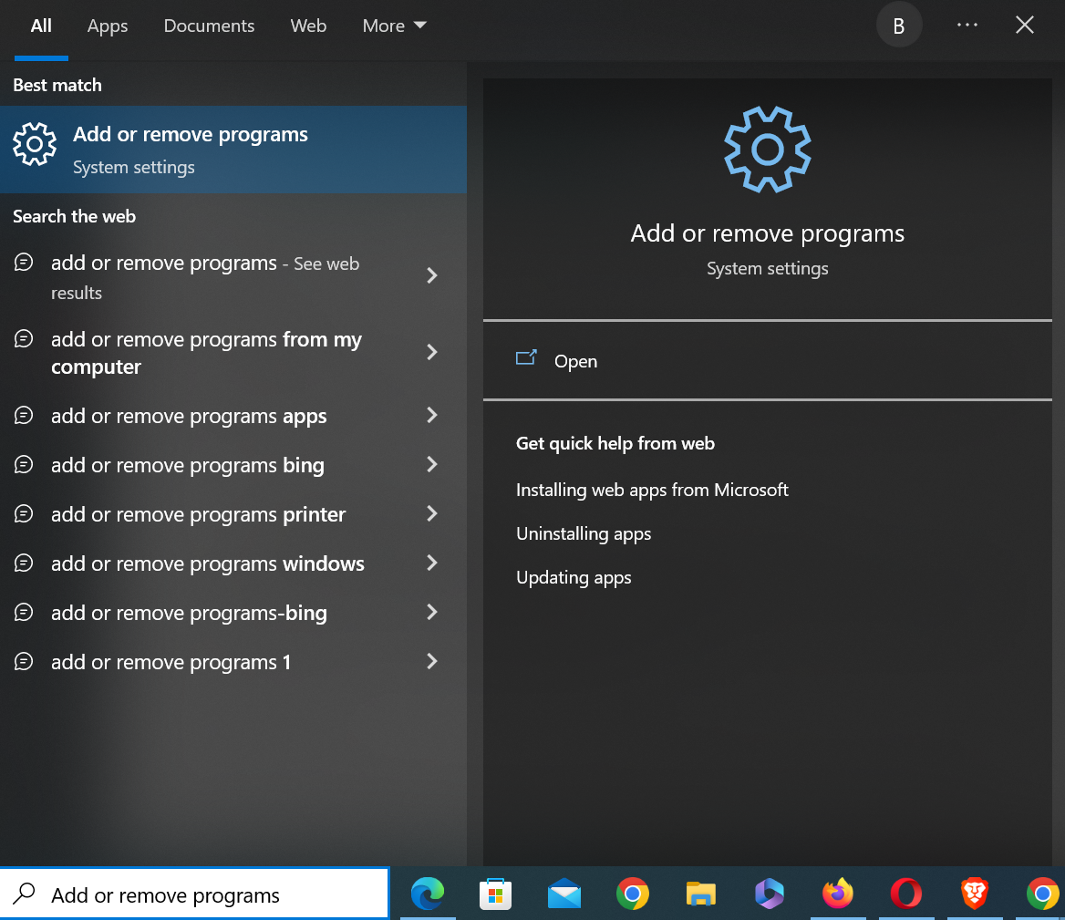 - Search for “Add and Remove Programs” on the search bar and access the first option.