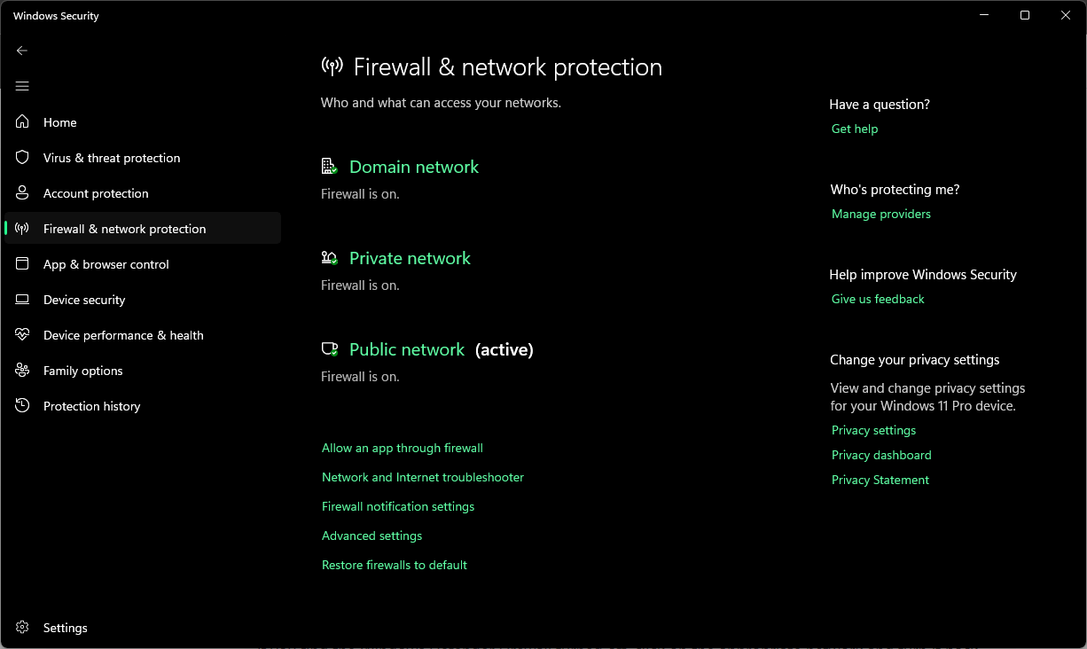 - Here, you can check whether the firewall is active for both private and public network configurations.