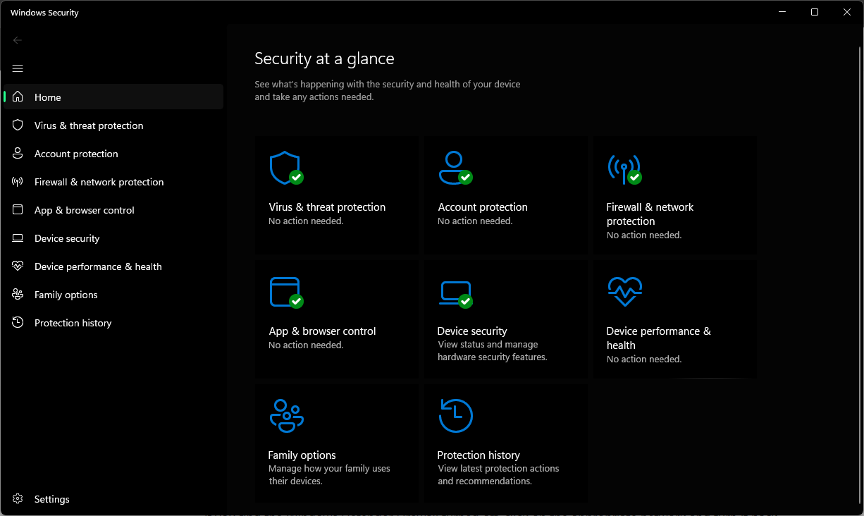 - In the Windows Security window, you’ll find various options for virus & threat protection, firewall & network protection, and more.