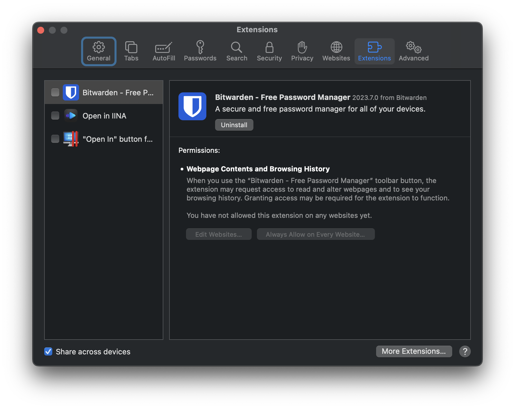 - Disable Extensions: Go to the “Extensions” tab in Settings, select each extension and click “Uninstall.” Most Safari extensions are apps or connect with a native app, so you’ll need to remove that in order to get rid of the extension.