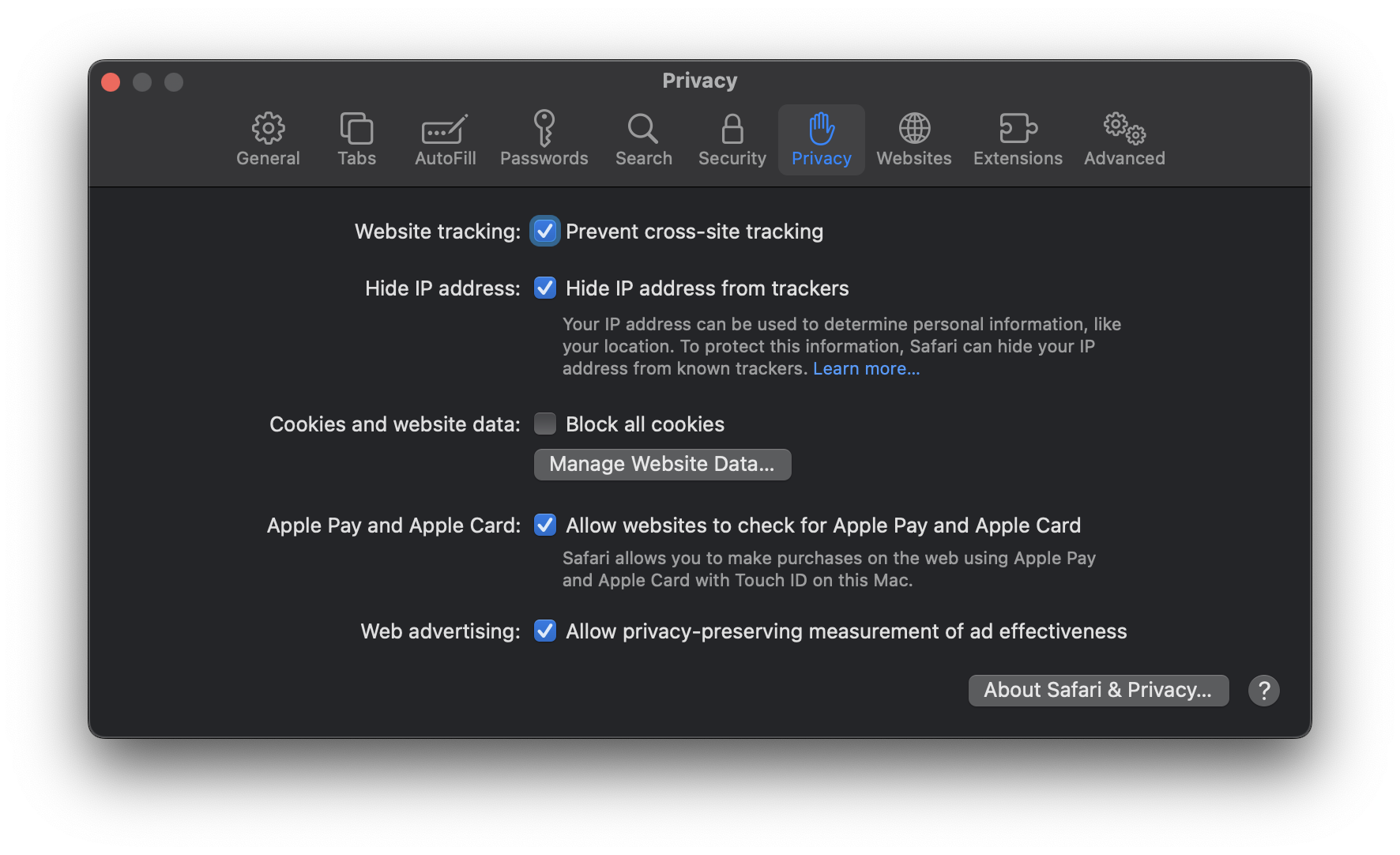 - Clear Cookies: For clearing cookies and website data, go to the “Privacy” tab, click on “Manage Website Data“, then “Remove All.”