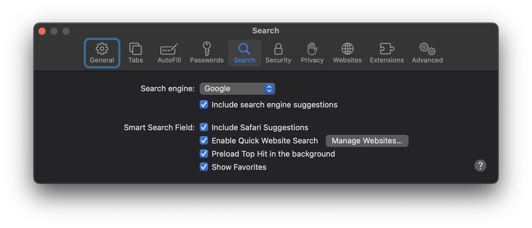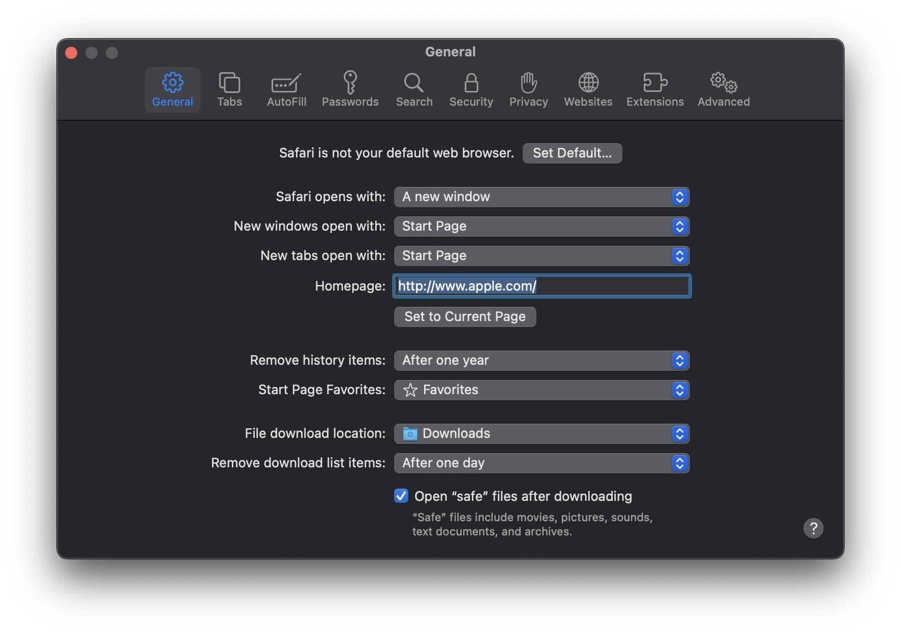 - Reset General Settings: Click on “Safari” in the menu bar and select “Settings.” In the “General” tab, reset your default homepage to whatever you want. Then, switch to the “Search” tab and change the search engine to Google, or any other option you prefer.