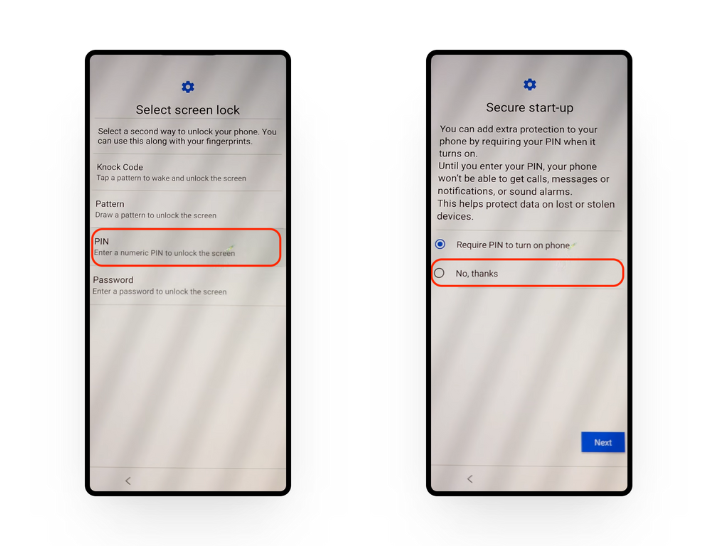- A prompt for “Secure start-up” might appear, asking if you want to require a PIN every time your phone reboots. Tap “No, thanks.”