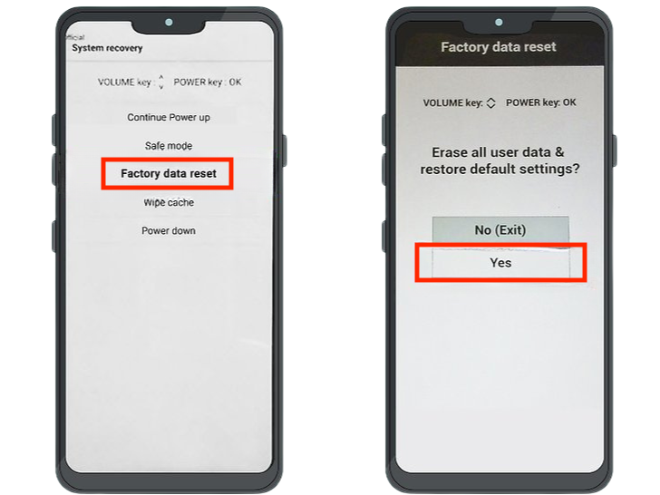 - From the menu, choose “Factory data reset.” You may need to use the physical buttons on the phone to navigate around the UI.