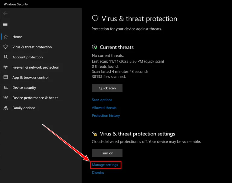 - Under Virus & threat protection settings, click Manage settings.