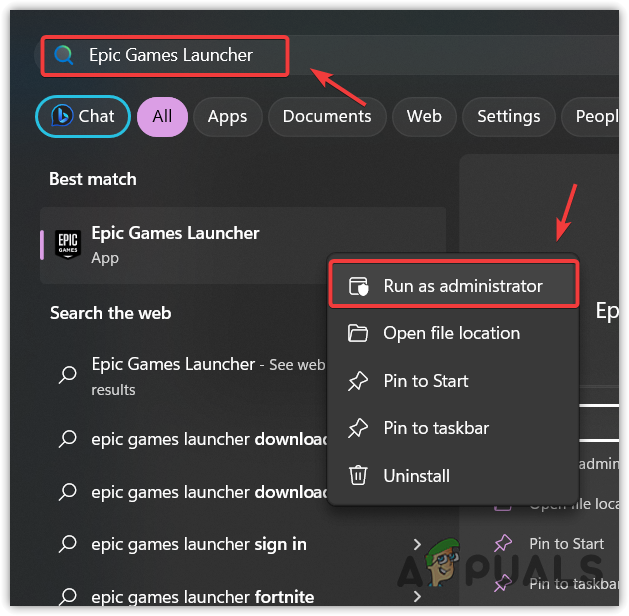 - Right-click the Epic Games Launcher and select Run as administrator.