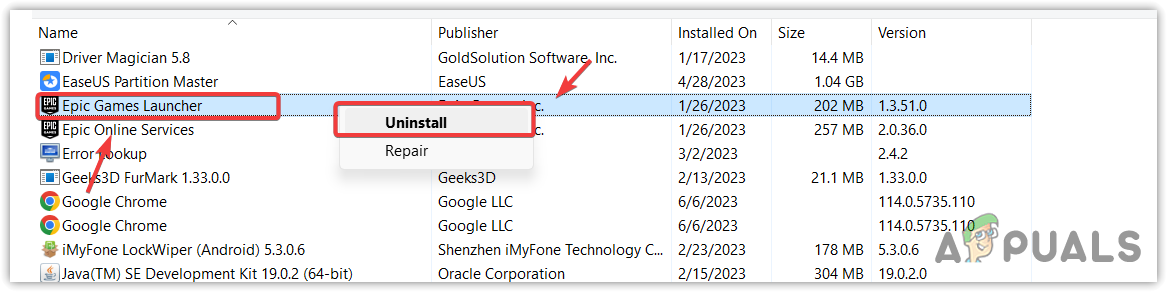 - Right-click the Epic Games Launcher and click Uninstall. This will prompt you to an Epic Games uninstallation Window. Simply click Uninstall.