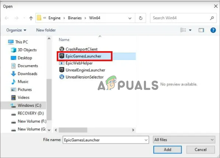 - Browse the executable launcher file (Default: C:\Program Files (x86)\Epic Games\Launcher\Engine\Binaries\Win64)
