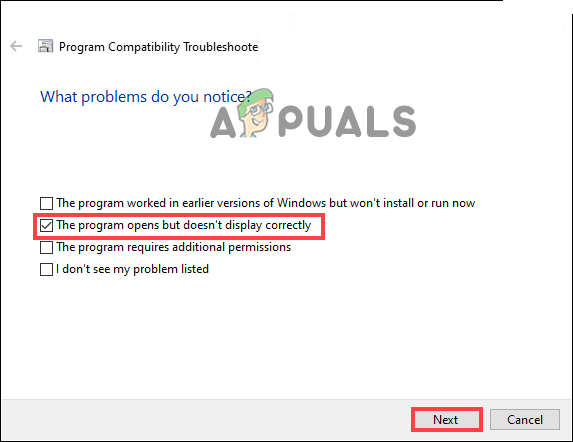 - Then checkmark the option box The program opens but doesn’t display correctly and tap on Next.