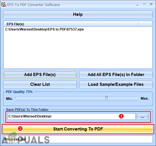 Adding the EPS file in the converter - Provide the path to save the file. Click on the Start Converting To PDF button at the bottom and wait for the progress to complete.