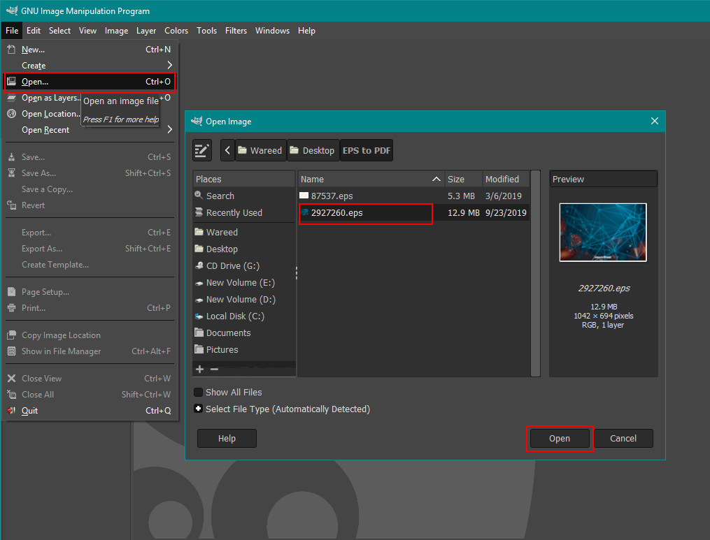 - Click on the File menu in the menu bar and choose the Open option. Find the EPS file and open it in GIMP. It will provide further options that you can choose or just click on the Import button.