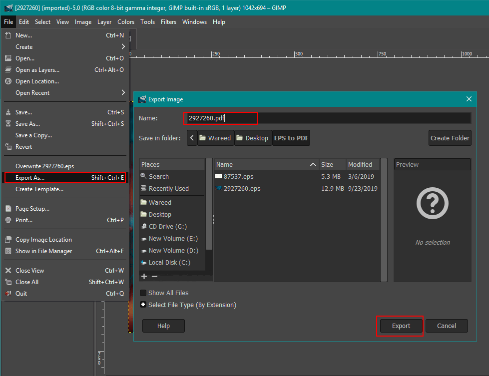 In this method, we will be using the Image editor for converting the EPS to PDF. Unlike the above methods, where we used the converters made especially for EPS to PDF conversion. GIMP is one of the best image editors available for multiple platforms. Through GIMP you can also edit the EPS file before changing it to a PDF. Follow the below steps to change EPS to PDF through GIMP: