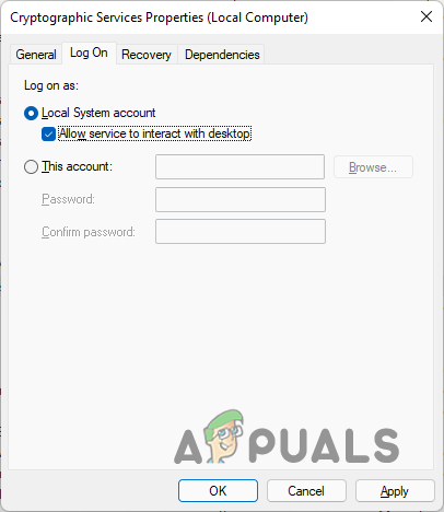 - There, choose the Local System account option and make sure the Allow service to interact with desktop checkbox is ticked.