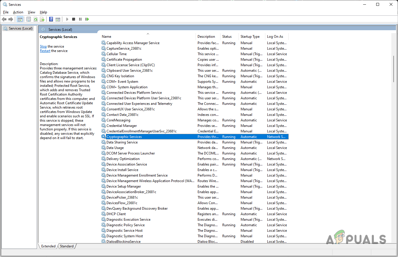 Opening Services Window as Admin - This will open up the Services window. From the list of services, look for Cryptographic Services.