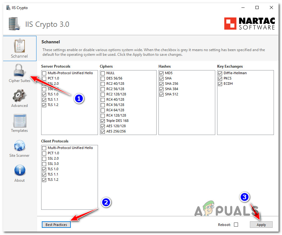 You can disable these cipher suites manually, but there’s really no need to overcomplicate things when you can use this utility called IISCrypto.