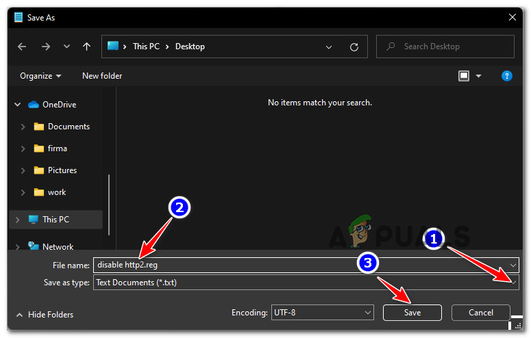 - Assign a name under file name, but make sure the name of the file ends with .reg. Once you’re ready, click on Save to generate the .REG file that you’ll use to disable HTTP/2.