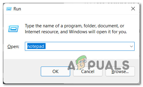 - Press Windows key + R to open up a Run dialog box. Next, type ‘notepad’ inside the text box, then press Ctrl + Shift + Enter to open a Notepad instance with admin privileges.