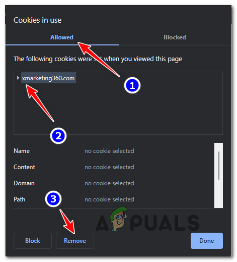Accessing the cookies tab - Next, once you arrive inside the dedicated cookies menu, select the Allowed cookies tab, then select each cookie from the list below and click on Remove to take care of it.
