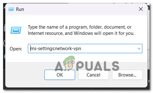 - Type ‘ms-settings:network-vpn’ inside the prompt that just appeared and press Enter to open the VPN tab of the Settings menu.