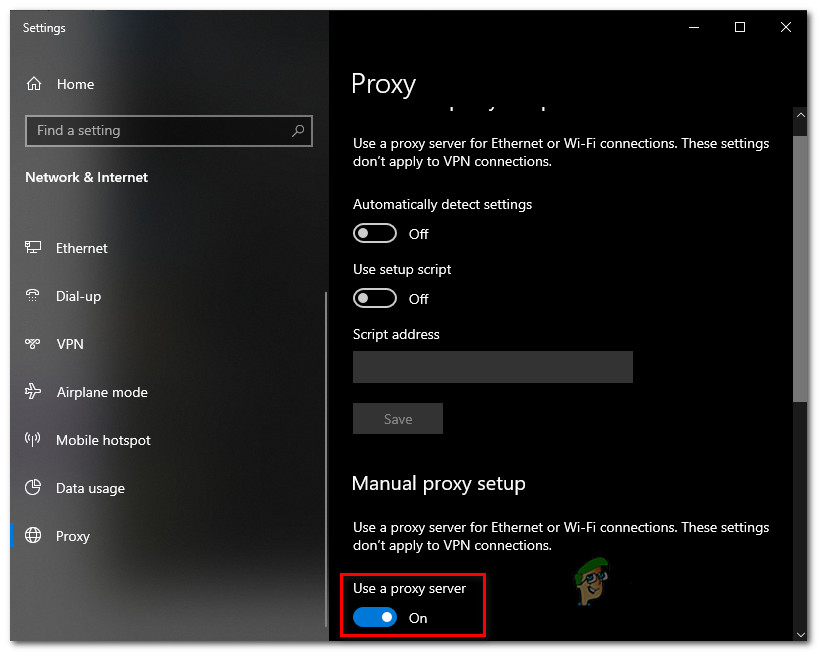 Disable the proxy server 3. After disabling the proxy server, close the Settings menu and reboot your PC before attempting to visit the same website that was previously triggering the ERR_SSL_PROTOCOL_ERROR.