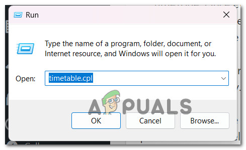- Type ‘timetable.cpl’ in the text box and press Enter to open the Date & time window.