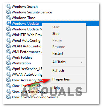 - After you manage to locate the correct entry, right-click on the Windows Update service and choose Properties from the context menu.