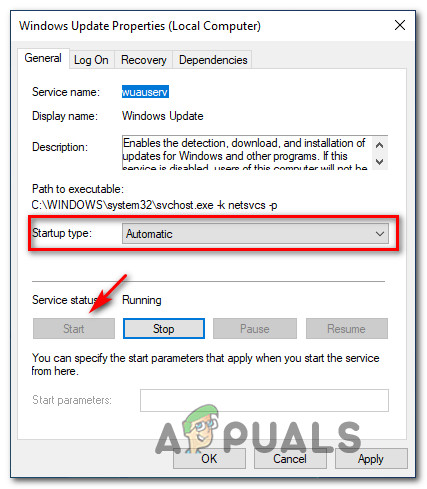 Accessing the Properties screen - Once you’re inside the Properties screen, access the General tab and modify the Startup type to Automatic before clicking on Start to force start the Windows Update service.