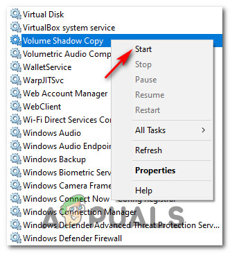 - Volume Shadow Copy is Disabled – If you’re encountering this issue while attempting to use DllRegisterServer commands from a CMD or Powershell terminal, chances are the error is triggered because the Volume Shadow Copy service is disabled. If this scenario is applicable, you should be able to fix the issue by enabling the Volume Shadow copy from the Services screen.