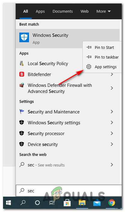 - From the list of results, right-click on Windows Security and choose App Settings from the context menu that just appeared.