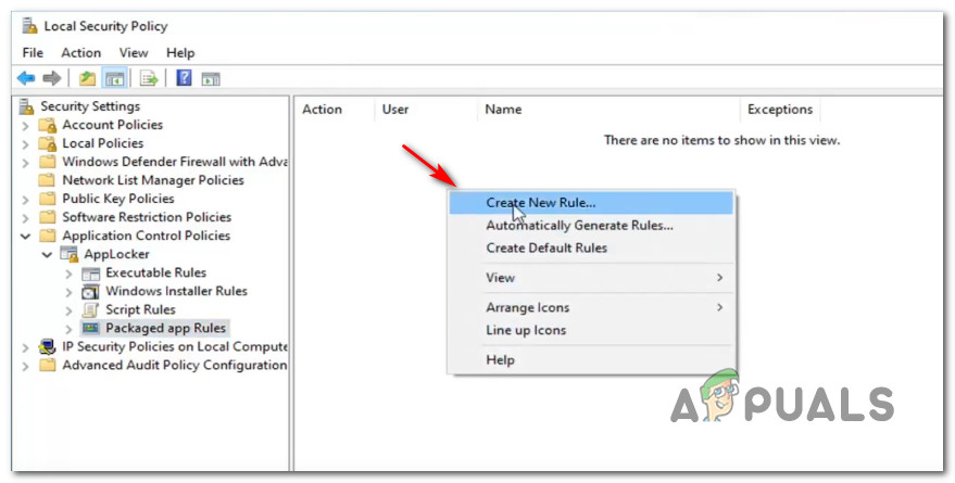 Note: In case the operation is successful and you want to re-enforce the Aplocker rules you had previously, return to the Packaged app Rules path inside Local Security policy. - From the context menu that just appeared, click on Create New Rule.