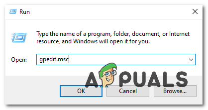 - Press Windows key + R to open up a Run dialog box. Next, type ‘gpedit.msc’ inside the text box, then press Enter to open up the Local Group Policy Editor. At the UAC (User Account Control), click Yes to grant admin access.