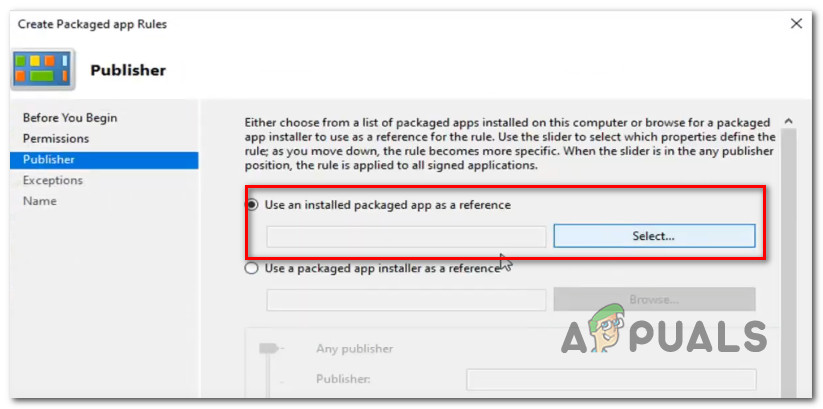 - Once you get to the Publisher section, check the Use an installed packaged app as a reference, then click on Select.