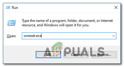 To perform a reset of the Windows Store Cache, press Windows key + R to open up a Run dialog box. Next, type ‘wsreset.exe’ and press Ctrl + Shift + Enter to perform this action with admin access.