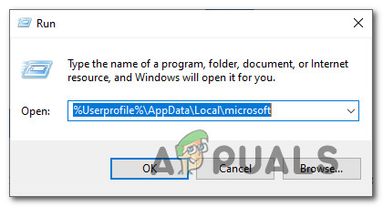- Next, press Windows key + R to open up a Run dialog box. Inside the run box, type ‘%Userprofile%\AppData\Local\microsoft‘ and press Enter to open up the subdirectory where your Windows installations keep temporary files related to Windows Live Mail, Photo Gallery, Windows Live, Windows Live Setup, etc.