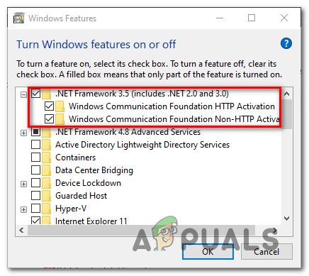 Enabling Windows Features - Once you’re inside the Windows features screen, ensure that the checkbox associated with .NET Framework 3.5 (also includes .NET 2.0 and 3.0) and click on Ok to save the changes.