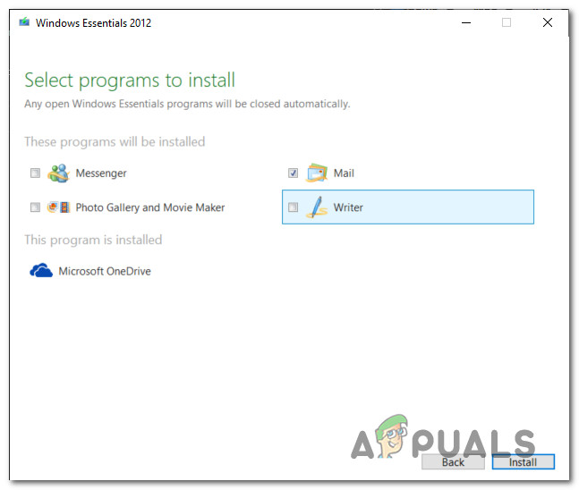 Choosing the programs you want to install - Next, from the list of programs available as part of the Windows Essentials suite, check the items that you want to install and uncheck everything else before clicking on Install.