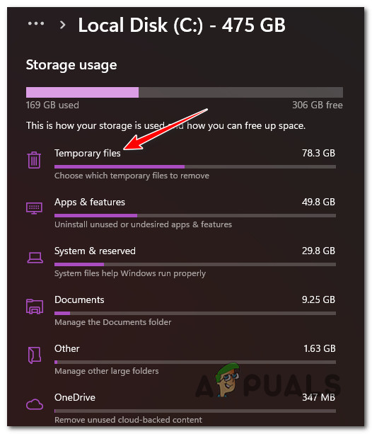 Access the Storage usage menu - Once you’re inside the Storage usage menu, start by clicking on Temporary files from the top of the screen.