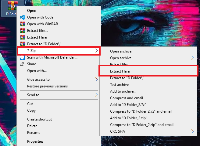 - Right-click the archive > 7-Zip > Extract Here (or Extract to “Folder\”).