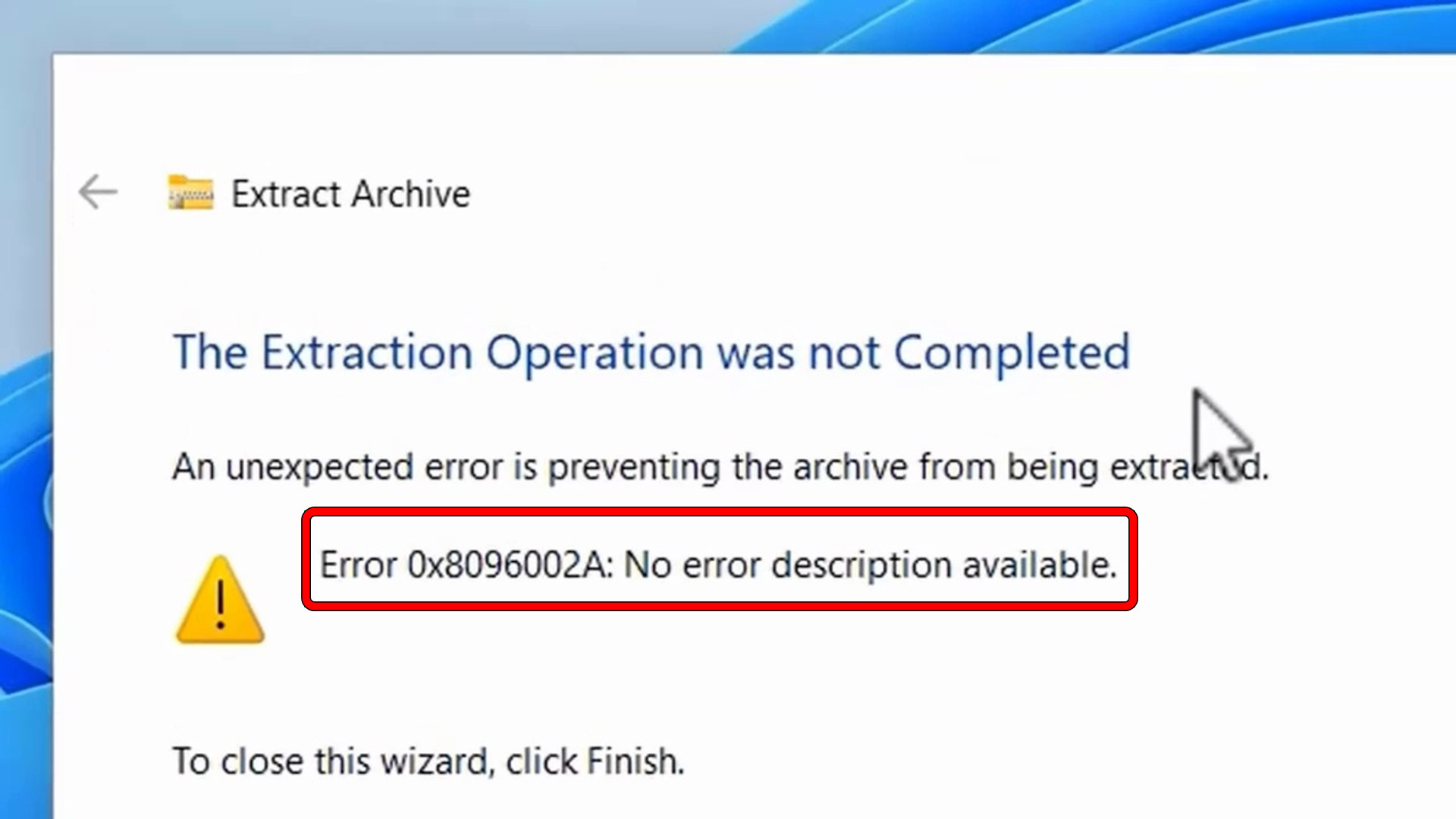 The “Error 0x8096002A: No error description available” message usually appears when you try to extract a
