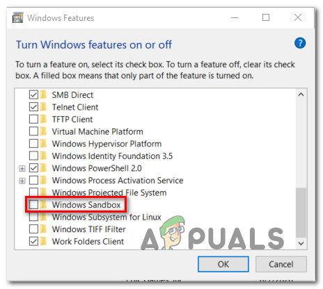 Accessing the Windows Features screen - Once you’re inside the Windows Features screen, scroll down through the list of native features and ensure that the checkbox associated with Windows Sandbox is disabled.