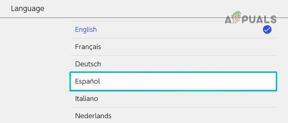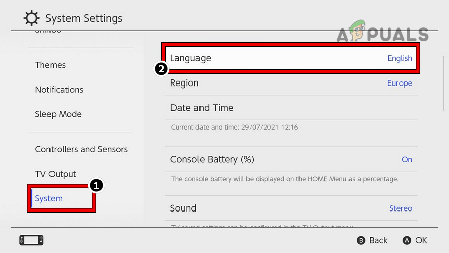 Open Language in the System Tab of the Nintendo Switch - Once the interface is shown in the new language, revert the language setting to your preferred language (like English) and check if the Switch is clear of the error 2123-1502.