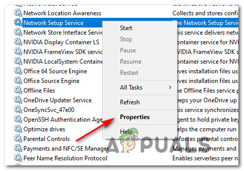 - Once you’re inside the Services screen, move over to the right-hand section of the screen and locate the Network Setup Service.