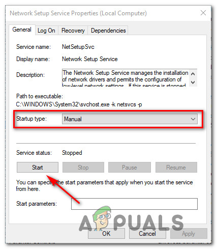 Accessing the Properties screen - Once you’re inside the Properties screen, access the General tab and set the Startup type to Manual using the drop-down menu before clicking on Start below to force-start the service.