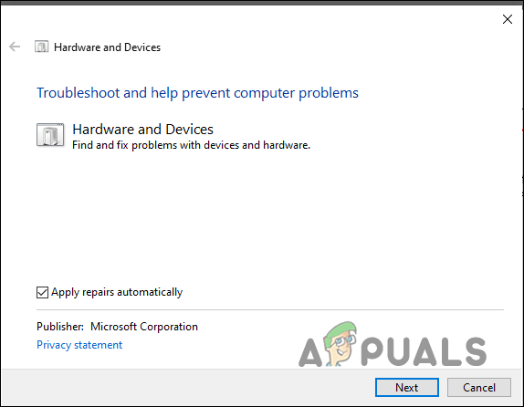 - This should launch the Hardware and Devices troubleshooter on your system. Click Next in the dialog that has popped up on your screen.